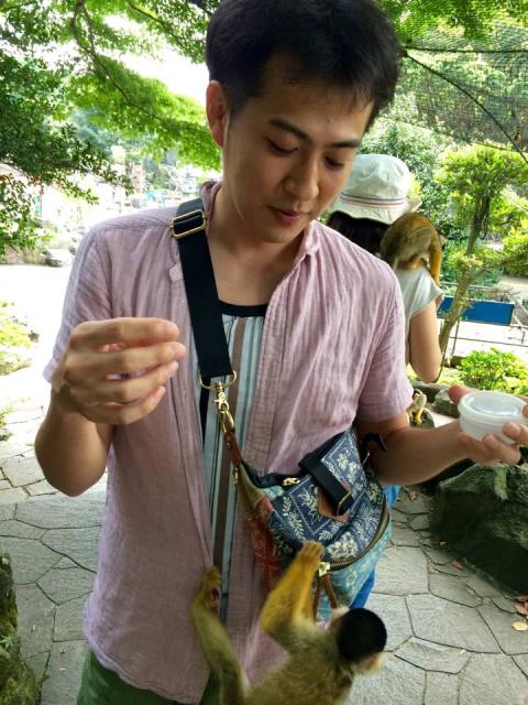 リスザルに餌をやっています。